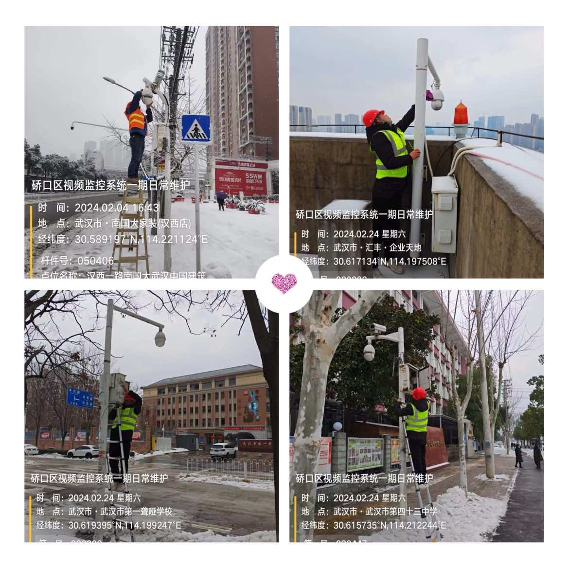 為應(yīng)對春節(jié)前凍雨對前端設(shè)備造成的破壞、確保城市視頻監(jiān)控系統(tǒng)發(fā)揮春節(jié)時期保平安的作用,公司運維服務(wù)部硚口城市視頻運維服務(wù)組在春節(jié)期間無一人休息,全部堅守崗位對前后端設(shè)備進行檢修維修。為應(yīng)對開工后新一場凍雨且臨近新學(xué)期開學(xué),公司運維服務(wù)部立即加派人手對校園周邊視頻監(jiān)控點及轄區(qū)高點監(jiān)控逐一檢查維修,為校園周邊環(huán)境安全順利開學(xué)、為政府掌握除雪進度及道路暢通情況提供技術(shù)支撐。