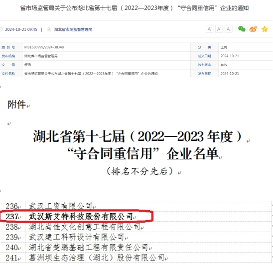 為進一步發揮信用監管的基礎性作用,推進企業合同信用體系建設,根據《湖北省合同監督條例》《湖北省企業合同信用狀況公布暫行辦法》規定,省(市)市場監管局、省(市)發展改革委聯合開展了2022—2023年度武漢市“守合同重信用”企業公布活動和第十七屆湖北省“守合同重信用”企業推薦活動。我司被認定為“2022-2023年度武漢市守合同重信用企業”和“湖北省第十七屆(2022-2023年度)守合同重信用企業”。